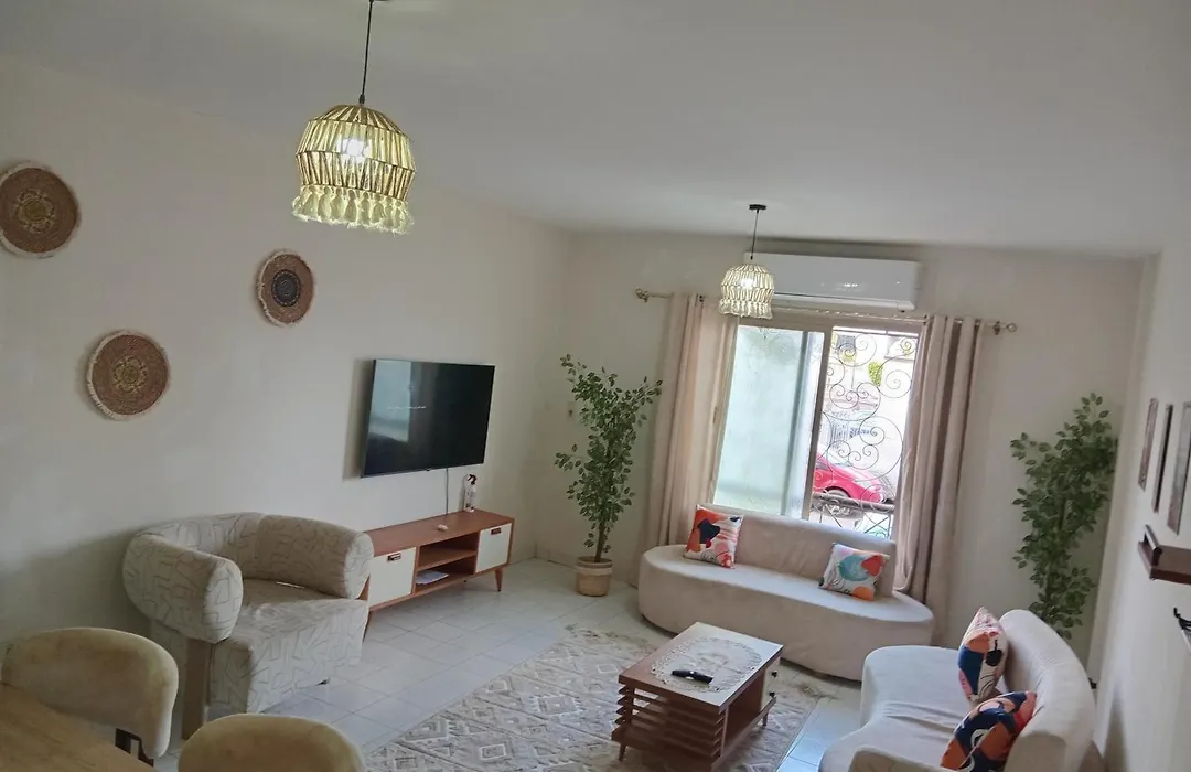 The 110 m² 2 Bedrooms Fully Air-Conditioned Rehab Market Cairo apartment is located 2.6 km from the landscaped garden "Family Park" and about a 20-minute walk from Talaat Mostafa Mosque.